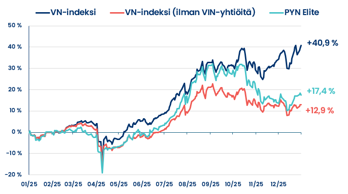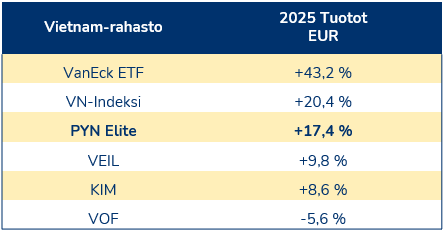 PYN Elite kirjasi 17,4 % tuoton vuodelta 2025. Euron vahvistuminen olisi syönyt vuoden aikana melkoisesti PYN Eliten salkun osakkeiden tuottoja, mutta tuo euron vahvistuminen saatiin kontrolloitua EUR/USD-valuuttasuojauksin. PYN Elite onnistui vuoden ensimmäisen yhdeksän kuukauden aikana saavuttamaan erinomaisen 30 % tuoton hyvin valituilla positioilla, ilman VIN-omistuksia, mutta harmillisesti vuoden kolmen viimeisen kuukauden aikana Vietnamin pörssiosakkeet laskivat laajalla rintamalla, mukaan lukien lähes kaikki pankki- ja finanssialan osakkeet. Samaan aikaan VIC:n osake jatkoi ylöspäin. Tuo kolmen kuukauden jakso heikensi olennaisesti PYN Eliten vuoden kokonaistuottoa.