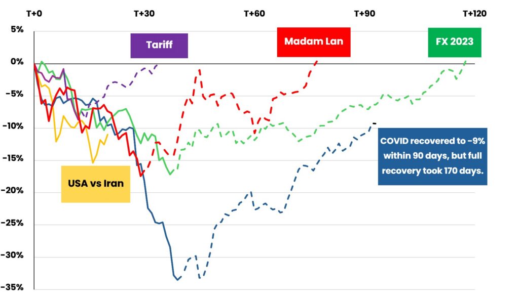 Oheiseen kaavioon olemme koonneet markkinatapahtumia vuosilta 2020–2026. Tapahtumat ovat aikajärjestyksessä: koronaepidemian puhkeaminen; kiinteistökeisari Madam Lanin pidätys; Vietnamin valuutan dongin heikkeneminen ja sitä seuranneet Vietnamin keskuspankin rahamarkkinan kiristystoimet; Trumpin tariffitaulukon julkistus ja USA:n ja Israelin hyökkäys Iraniin. Merkintä T+ ilmaisee päivinä ajan kurssilaskusta toipumiseen.