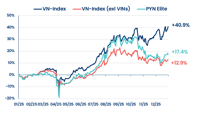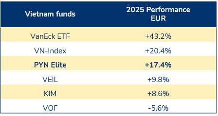 PYN Elite delivered a return of 17.4% in 2025. The strengthening of the euro would have eroded the returns of PYN Elite’s holdings over the year, but this was effectively managed through EUR/USD currency hedging. During the first nine months of the year, PYN Elite achieved an excellent 30% return through well-selected positions, without exposure to VIN-related holdings. Unfortunately, over the final three months of the year, Vietnamese equities declined broadly, including nearly all banking and financial sector stocks. At the same time, the VIC share price continued its outperformance. This three-month period weighed heavily on PYN Elite’s full-year returns.